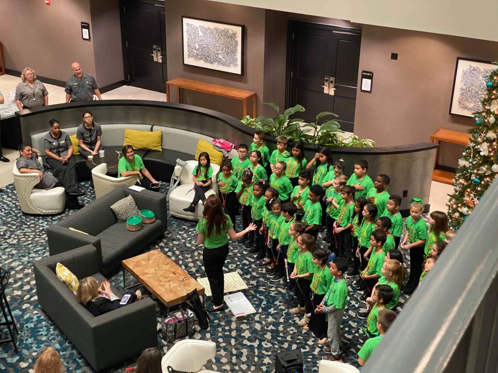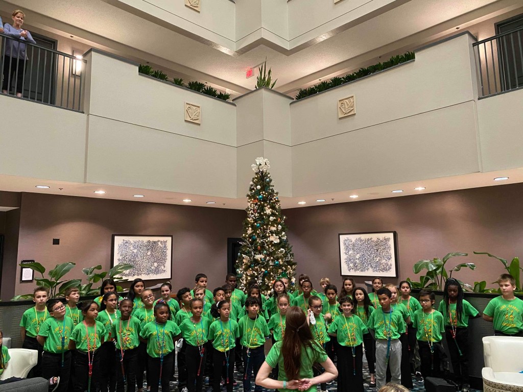 Our amazing Partners in Education, Embassy Suites near the Orlando Airport, invite us every year to sing for their wonderful staff and guests to celebrate the holidays. They set us up in their atrium that has the best acoustics and is the perfect musical spot! This year Beginning Jammers did an incredible job!
